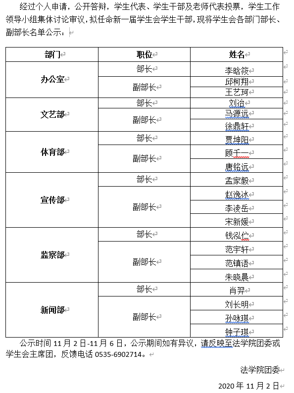 2020年法好色tv 学生会部长换届竞聘结果公示