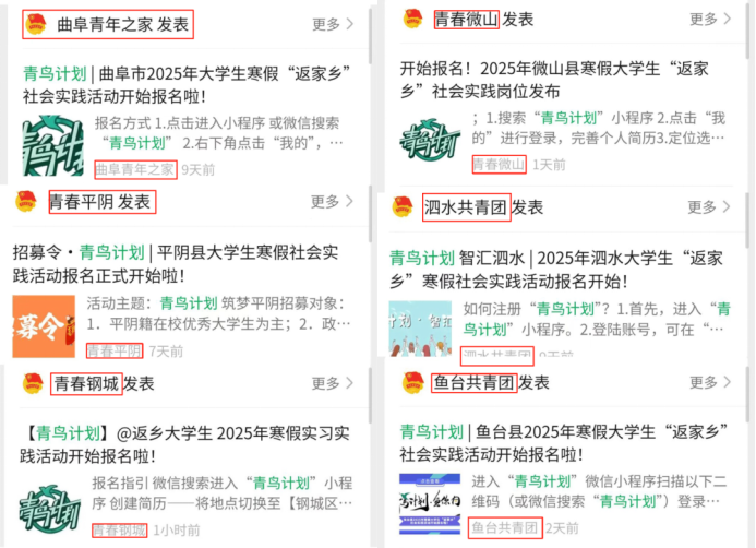 部分地区会通过团委公众号发布“返家乡”“三下乡”“青鸟计划”等信息,介绍活动内容及要求,公布实习实践岗位。通过关注地方团委公众号,按照要求报名参与寒暑期青鸟计划实习实践活动。