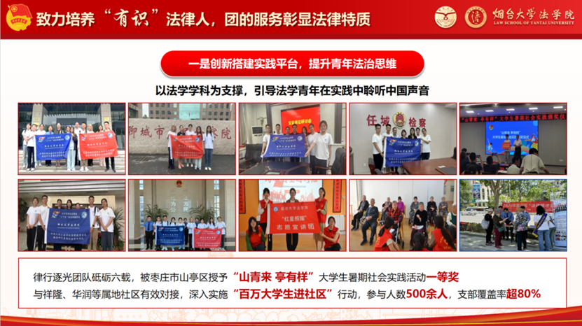 围绕“法律”元素,24支实践队在暑期以情释法、以理说法。入选“法治青春中国行”等国家级专项5项,国家级重点团队1项。律行逐光被山亭区授予“山青来”社会实践活动一等奖;深入实施“百万大学生进社区”行动,参与人数500余人,支部覆盖率超80%。