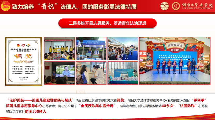 构建立足校园、服务社区、奉献社会的立体化法律志愿服务模式。获山东省志愿服务大赛铜奖一项;两人入选烟台“手牵手”孤困儿童中心志愿者库;1人获聘“烟台市公益普法大使”。