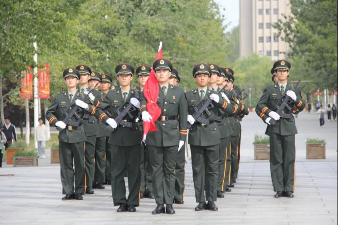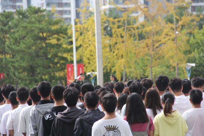 在综合楼前举行的喜迎国庆升旗仪式,全体辅导员老师、学生会主席团成员、大一新生代表出席仪式。