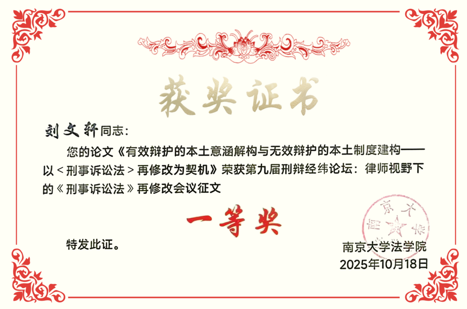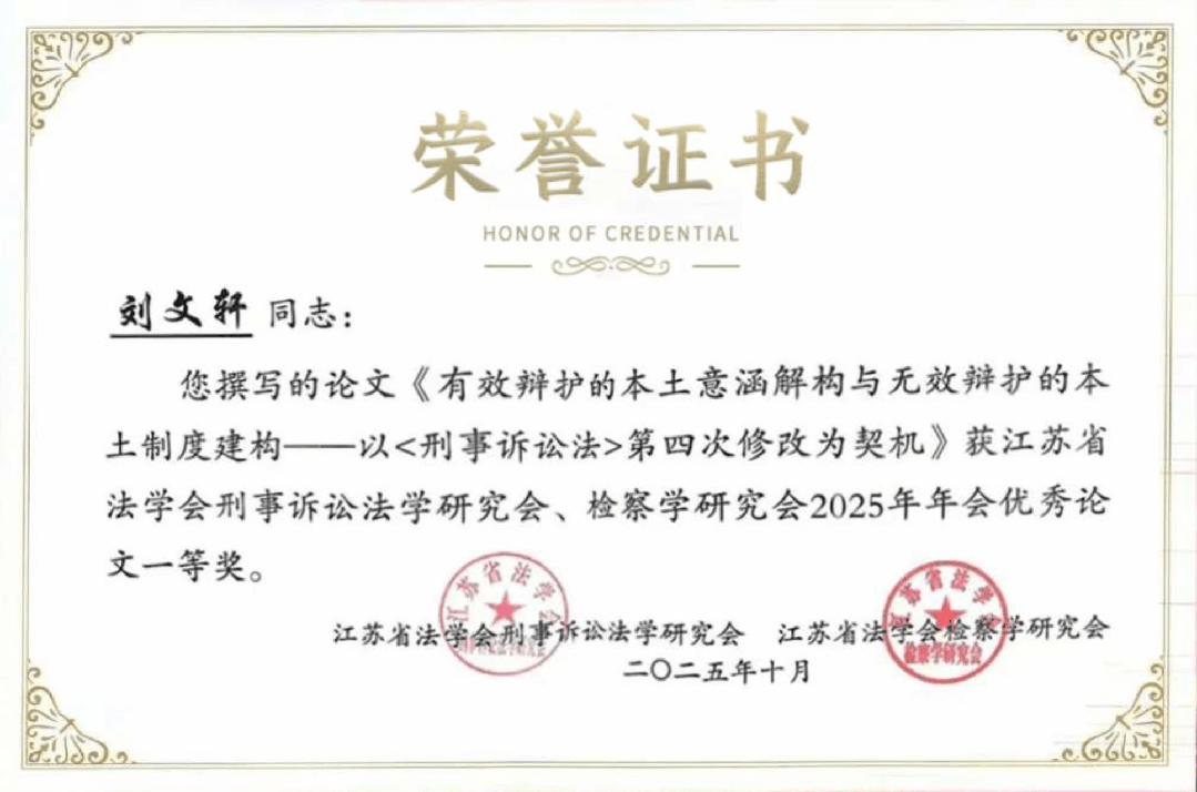 2025年10月16日至17日,江苏省法学会刑事诉讼法学研究会、检察学研究会2025年年会在南通市海门区举行。本次年会以“刑事诉讼法学、检察学自主知识体系与中国式法治现代化”为主题,汇聚百余名法学理论界专家、司法实务界同仁,深入研讨刑事司法领域前沿问题。我院优秀青年学者刘文轩副教授受邀参加此次年会,并就其最新研究成果做学术报告。其撰写的《有效辩护的本土意涵解构与无效辩护的本土制度建构——以〈刑事诉讼法〉第四次修改为契机》一文,获评“年会优秀论文一等奖”。