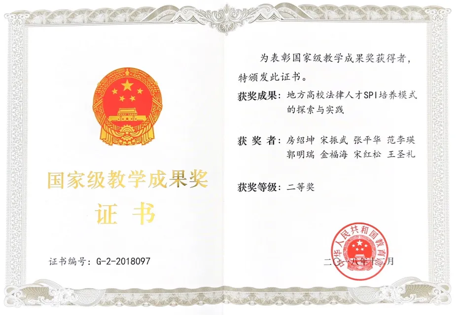 以国际化教育成果为主要内容之一的法学教学成果《地方高校法律人才SPI培养模式的探索与实践》获得国家级教学成果奖二等奖。