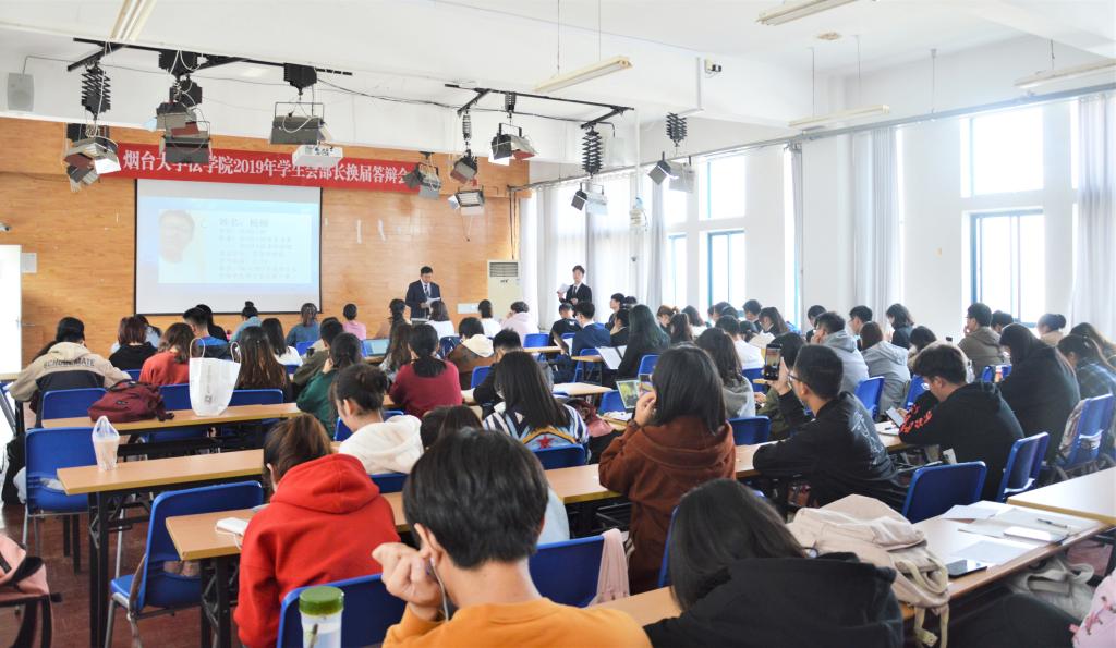学生会部长换届答辩会。本场答辩会2016级辅导员刘运正,2017级辅导员孙世玉,2018级辅导员陈默,2019级辅导员王颖出席。