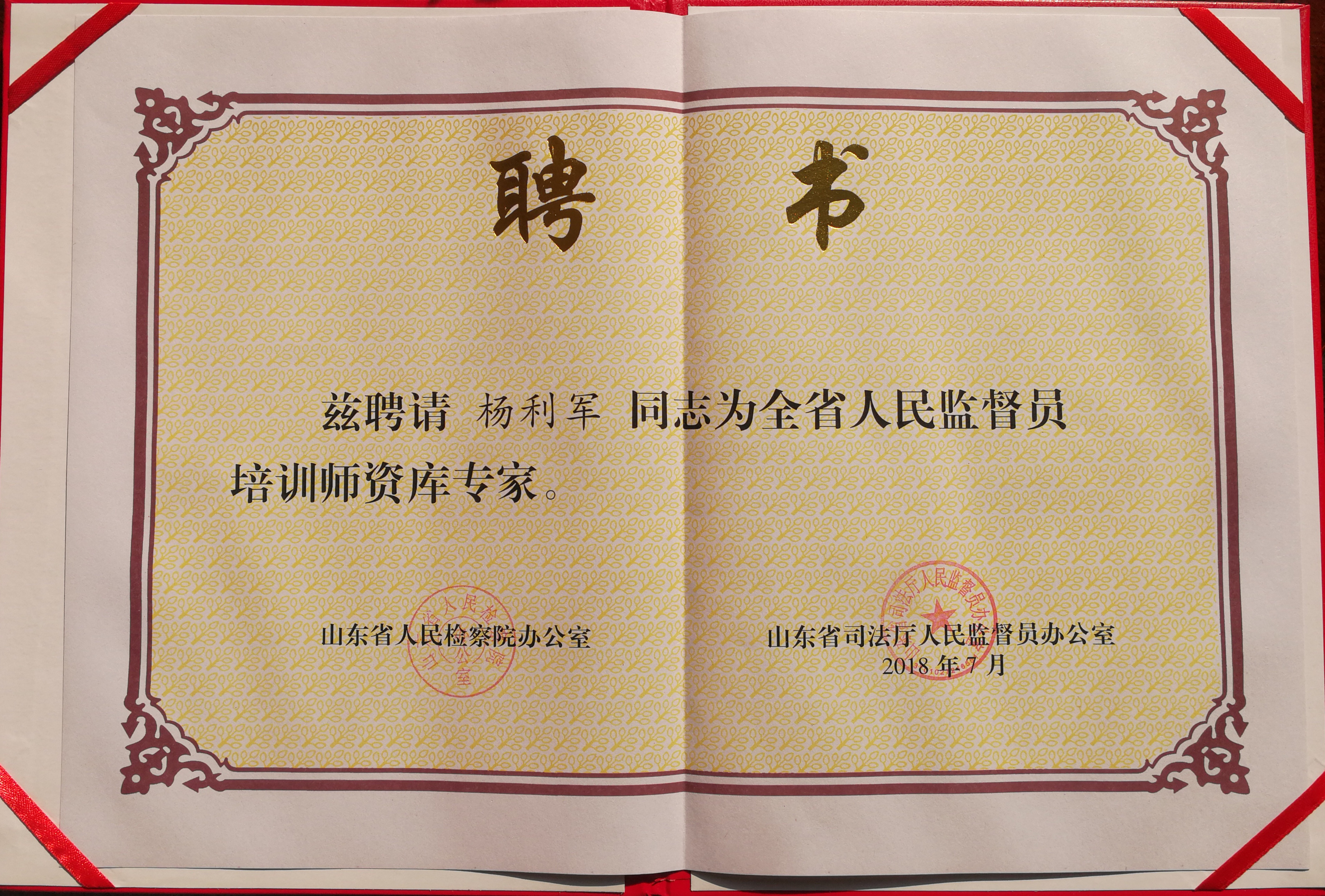 教师杨利军受邀参加了本次会议并做了题为《新刑诉背景下的人民监督员工作》的主题发言,同时经过推荐被聘为首届“山东省人民监督员培训师资库专家”。