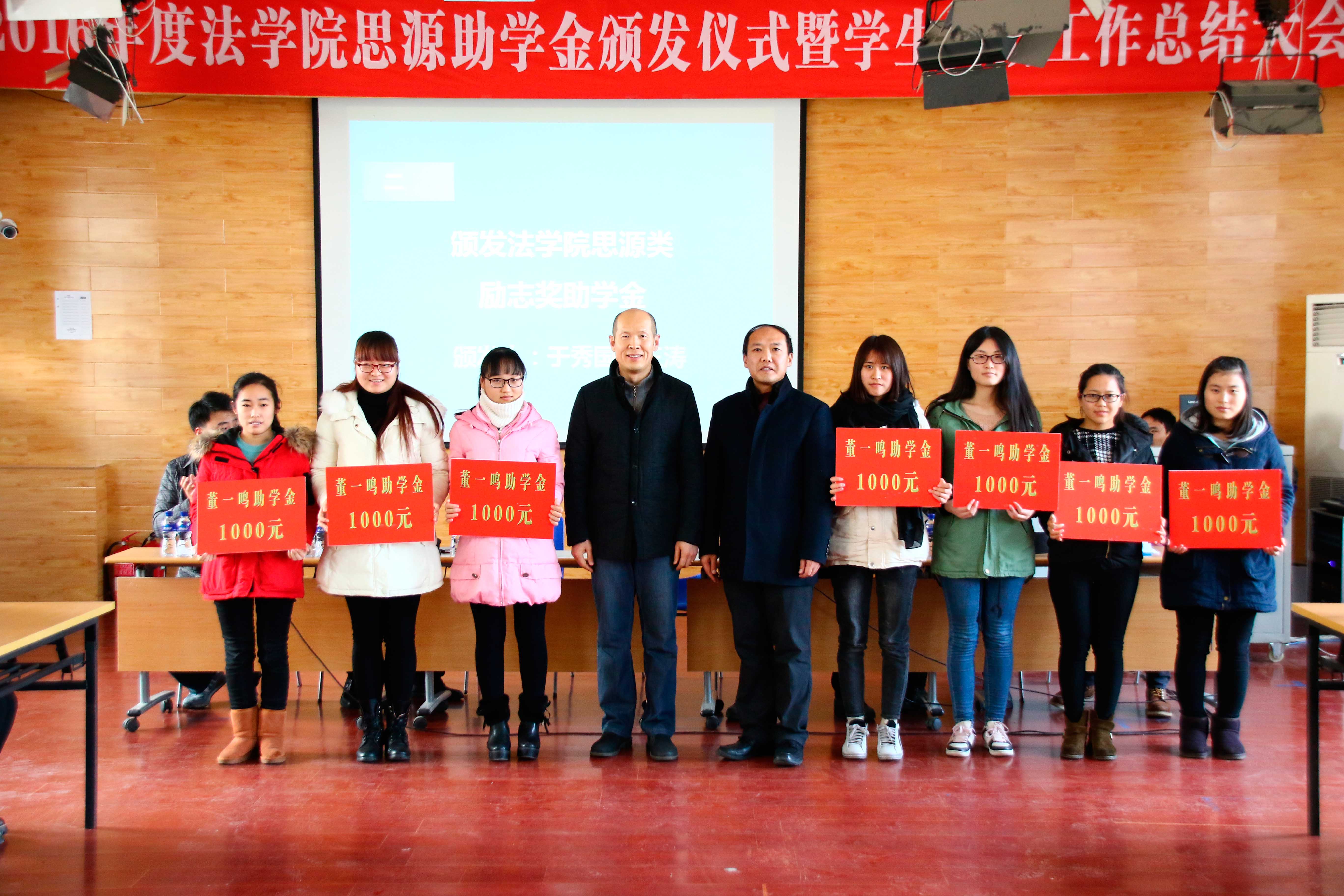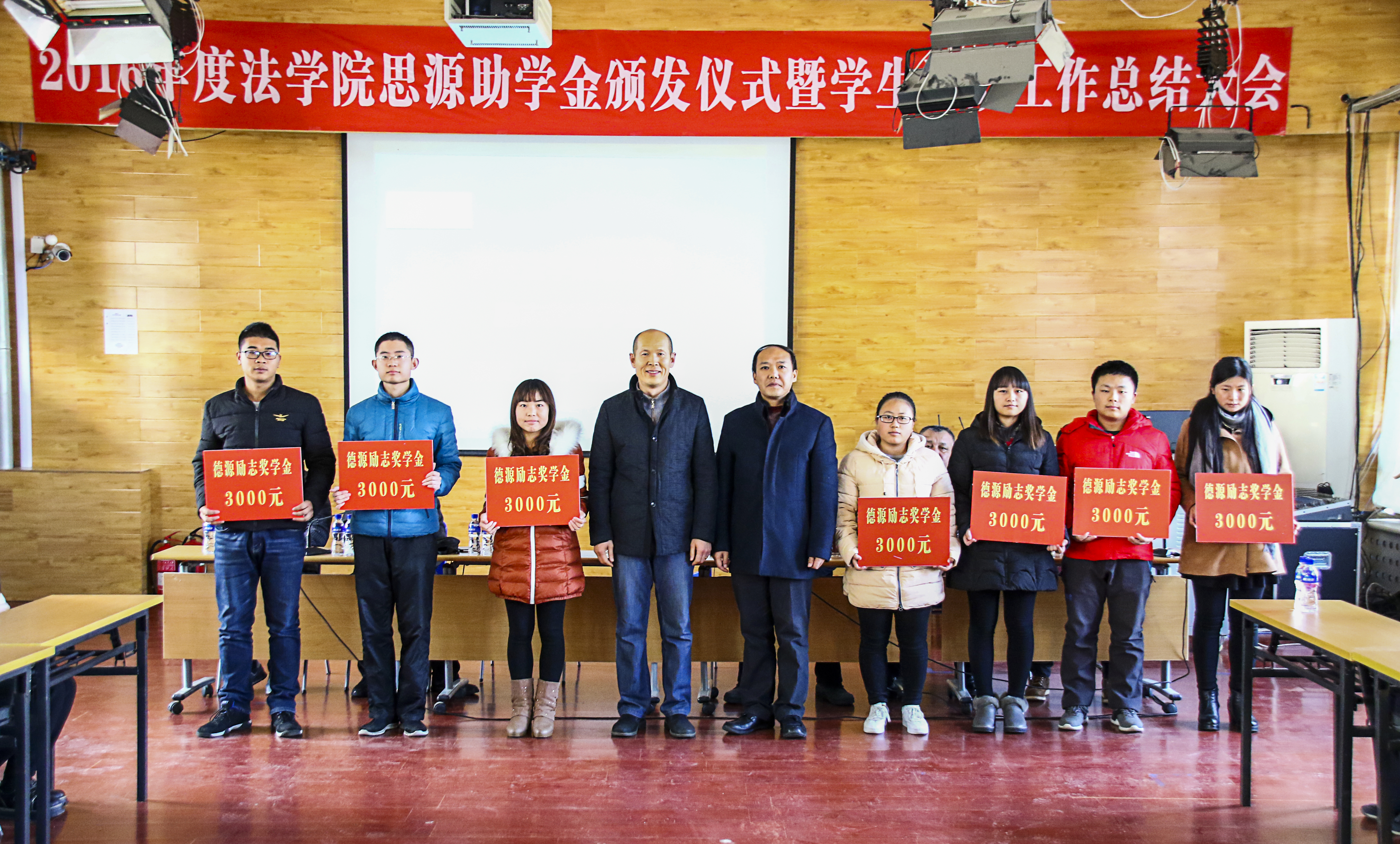 12月28日下午,法好色tv 举行“2016年度学生资助工作总结大会暨‘思源’励志类奖助学金颁发仪式”。好色tv 学生工作处处长于秀国、新疆籍少数民族学生服务管理教师得日夏提、尚建设,法好色tv 88级校友、山东德源化工机械有限公司总经理、德源励志奖学金设立者王涛受邀出席,法好色tv 院长张平华以及辅导员与在校的家庭经济困难学生共同参加了本次会议,党总支副书记亓健生主持了会议和颁发仪式。
