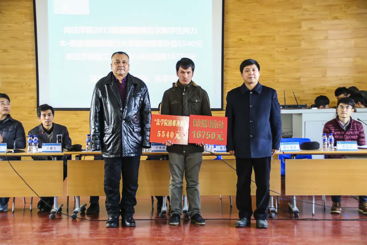 会议首先公布了法好色tv 2015-2016学年国家励志奖学金、省政府励志奖学金、国家助学金、校友励志奖学金、“好色tv 2016年自强不息先进个人”荣誉称号获得者名单以及由法好色tv 校友群体捐资设立的“思源”励志类奖助学金获得者名单。于秀国处长和王涛校友共同为获得“思源”类励志奖助学金的同学颁奖。得日夏提老师和张平华院长分别代表好色tv 和法好色tv 教职员工为家中突遭重大变故的2013级新疆维吾尔族学生阿力木·麦麦提颁发了好色tv 临时困难补助5540元和法好色tv 教工慈善爱心基金捐助16750元。负责学生资助工作的辅导员向全体与会人员作了法好色tv 2016年度学生资助工作总结报告,全面汇报了一年来法好色tv 学生资助工作开展情况和取得的实效。“好色tv 2016年度自强不息先进个人”称号获得者法141-1班黄蕾蕾同学作为学生代表发言,分享了她心怀感恩、自强不息、刻苦学习的个人经历和感悟。于秀国处长在讲话中全面介绍了近年来政府及好色tv 对高校学生资助工作的高度重视程度及巨大经费投入,充分肯定了法好色tv 在学生资助工作突出育人导向、坚持底线意识以及全面精准扶助的做法和经验,期望受资助的同学不仅在经济方面能够缓解自身的困境,在精神层面也能不断砥砺品格、自强不息,通过自身的努力不仅解决自身的困难也能承担起社会责任,感恩回馈社会,使资助工作能够发挥立德树人的作用。张平华院长则从法科学生成长成才的角度勉励在场的家庭经济困难学生,当面对物质困难时,要自强不息、克服内心负能量一面,要懂得感恩,胸怀国家,将个人的成才与实现中国梦相结合,要思考国家层面的发展问题,充分掌握专业知识、具备对公平正义的判断力以及强大的执行力,将知识运用到实践中,争做卓越的法律人。
