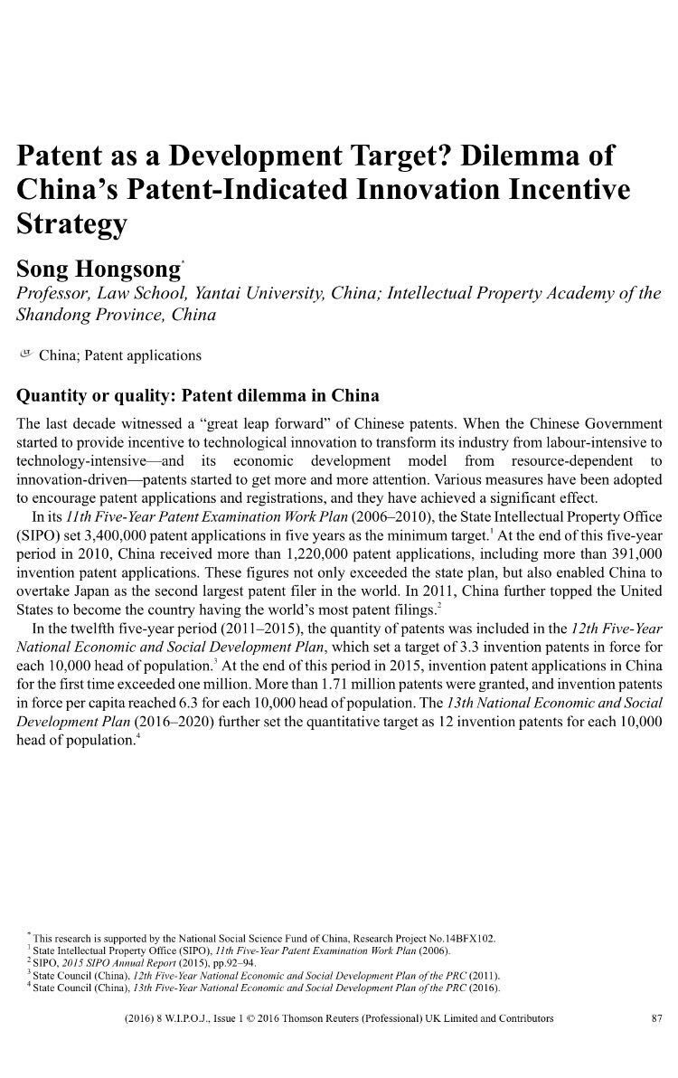 宋红松教授的论文“Patent as a Development Target? Dilemma of China’s Patent-Indicated Innovation Incentive Strategy(以专利为发展目标?——中国专利创新激励政策的困境)”。