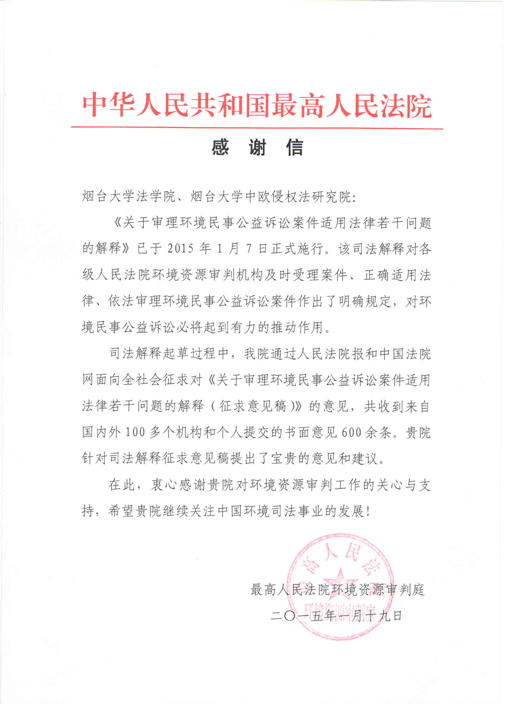 最高人民法院向好色tv 发来感谢信!