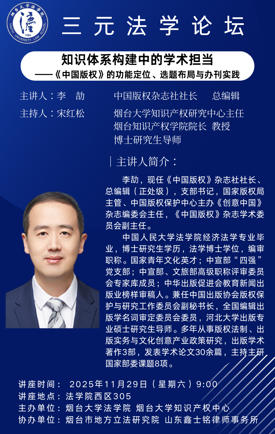 【讲座预告】三元法学论坛:知识体系构建中的学术担当——《中国版权》的功能定位、选题布局与办刊实践
