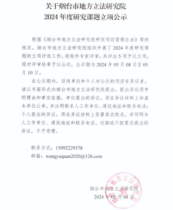 关于烟台市地方立法研究院2024年度研究课题立项公示