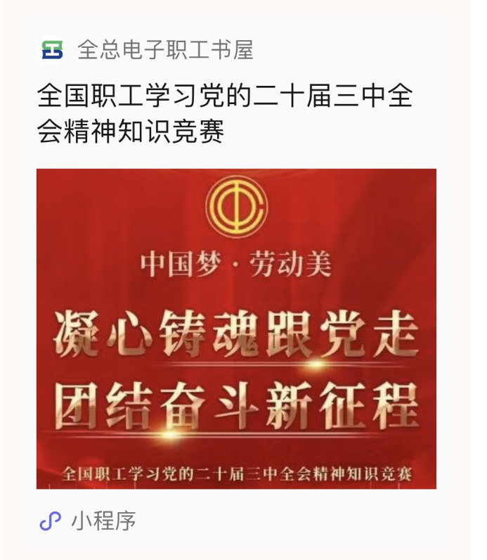 为深入学习贯彻习近平新时代中国特色社会主义思想和党的二十届三中全会精神,按照关于向广大职工群众宣传宣讲党的二十届三中全会精神工作方案,全国总工会将组织开展“中国梦·劳动美--凝心铸魂跟党走 团结奋斗新征程”全国职工学习党的二十届三中全会精神知识竞赛,引导广大职工认真学习贯彻党的二十届三中全会精神,为进一步全面深化改革、推进中国式现代化团结奋斗。
